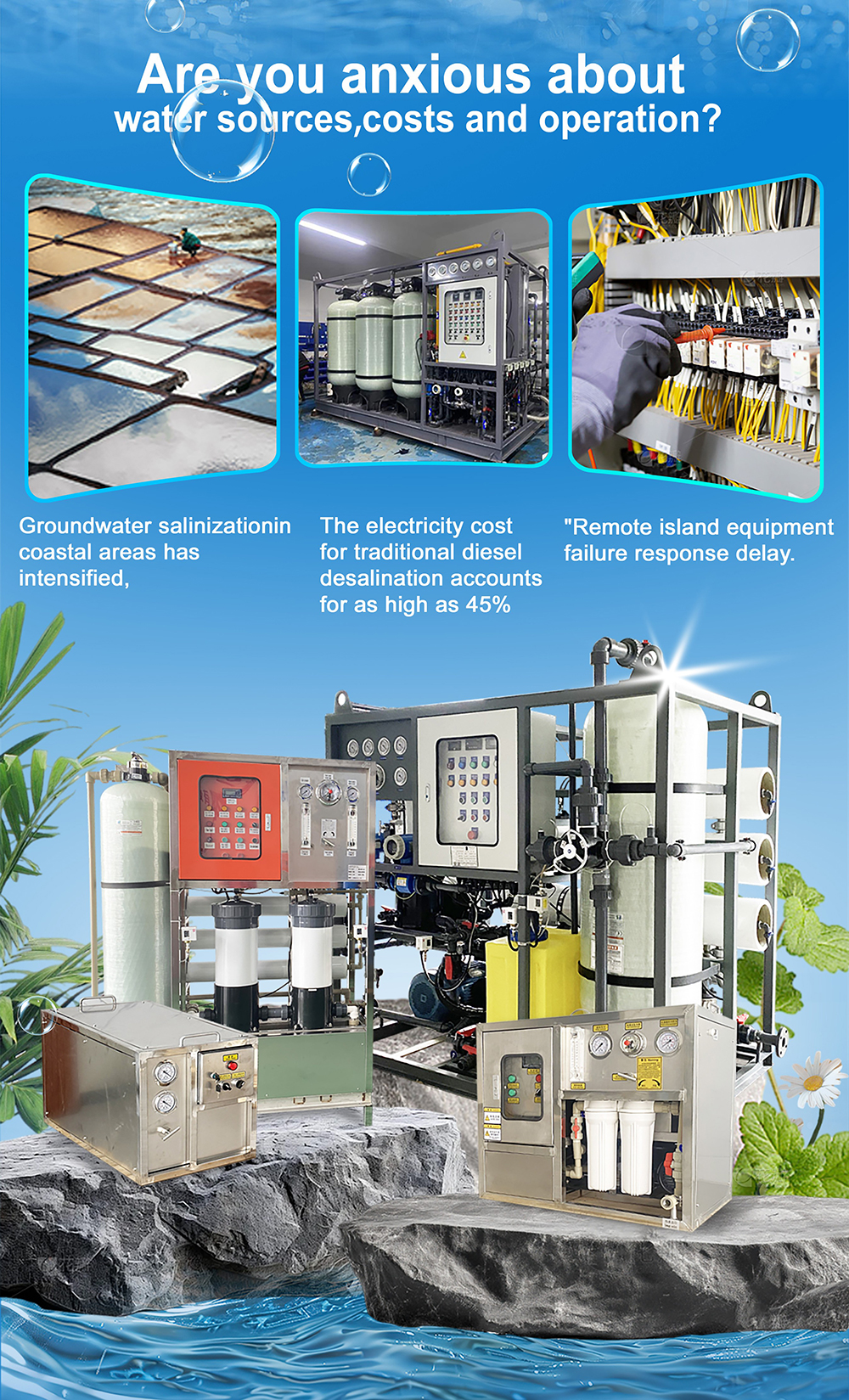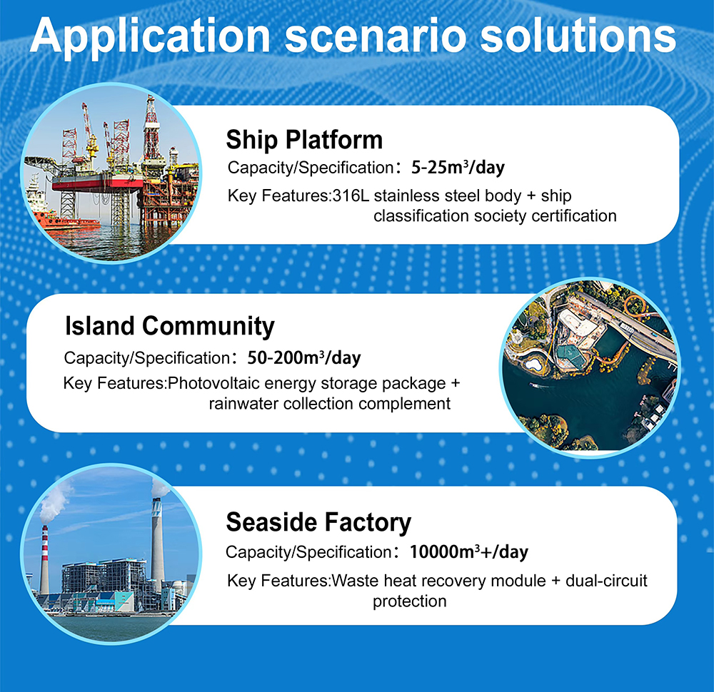 Our seawater desalination equipment is centered around customization, providing you with precise freshwater solutions. Whether you are an island community, hotel, ship, or industrial plant, we can provide modular design and configuration based on your water source characteristics, site limitations, and water production requirements (ranging from 1 ton to 10000 tons per day).